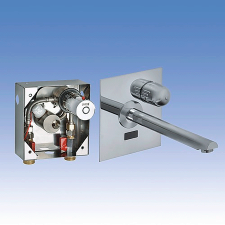 Автоматический кран с термостатом питания 24В со скрытой частью, две длины плеча вытекания (170 или 250 мм), функция автоматического выключения воды по истечении 5 минут времени, предназначена для холодной и теплой воды, температура настраивается термостатическим смесителем, давление подачи теплой и холодной воды должно быть равным, реагирует на присутствие рук в чувствительной зоне до 0,3 м от датчика немедленным пуском воды, время задержки выключения воды возможно настрoить в диапазону 0,25 — 7,75 сек.