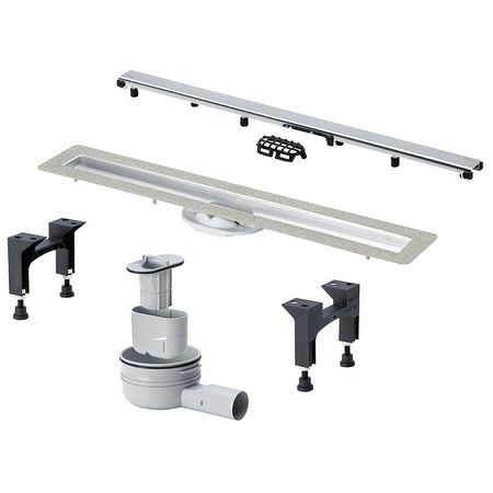 фланец с песчаным покрытием, решетка глянцевая, монтажные опоры, съемное устройство для защиты от неприятного запаха из системы канализации, возможность прочистки отводящего трубопровода, поворотный выпуск DN40, переход на DN50, сетчатый фильтр