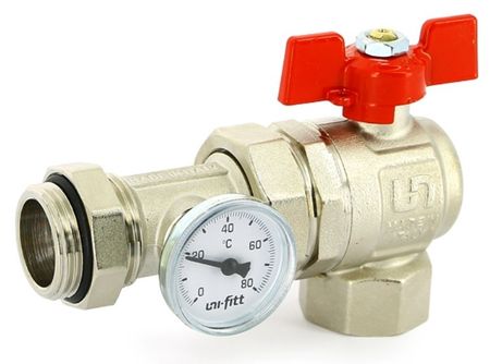 Шаровый кран Uni-Fitt (Юни-Фит) НВ 1 с разъёмным соед. и термометром для кол. групп, полнопроходной, бабочка используется для регулирования и перекрытия потока теплоносителя в системе отопления и трубопроводах. Изделие обладает высокой прочностью и имеет длительный срок службы, так как выполнено из никелированной латуни.
