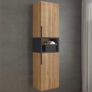 Подвесной шкаф-колонна с двумя створками и пространством для открытого хранения. Створки оснащены петлями с плавным закрыванием и черными матовыми алюминиевыми ручками. Фасады из влагостойкого ЛДСП увета дуб темно-коричневый.