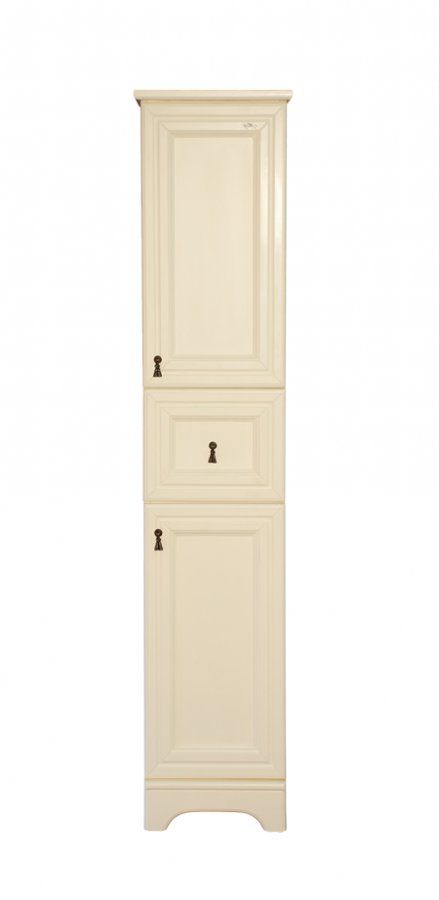 Подчеркнуть дворцовую роскошь современной ванной комнаты поможет шкаф-пенал Misty Лувр R, дизайн которого выдержан в стиле ампир. Для его фасадов из массива бука выбран оттенок слоновой кости, а для придания объема поверхностям накладные фрезы, которые элегантно сочетаются с необычными ручками-кистями под бронзу. Вместительные секции с распашными правосторонними створками и выдвижной ящик позволяют разместить всё необходимое.
