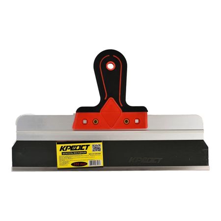 Фасадный шпатель, представляет собой инструмент, используемый в отделочных работах для нанесения, выравнивания строительной смеси. Шпатель состоит из полотна, изготовленного из нержавеющей стали, и двухкомпонентной рукоятки. Рукоятка не скользит в руке во время работы.