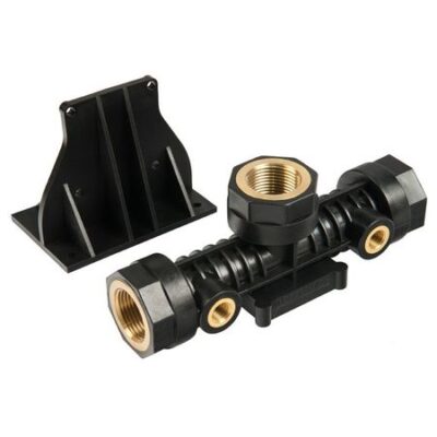 Устройство Unipump Коллектор 5-ти выводной настенный обеспечивает крепление автоматики насоса. Используемый полимерный материал обладает повышенной механической прочностью, противостоит коррозии, и износоустойчив. Подобный коллектор упрощает установку главных элементов насосного оборудования, состоящего из гидроаккумулятора, манометра и устройств автоматического управления насосами. Присоединения имеют следующее назначение: боковые выводы напорной магистрали с внутренней резьбой 1″, нижний вывод с внутренней резьбой 1″ для гидроаккумулятора, передние выводы под манометр и автоматику, управляющую насосом ( «, внутренняя резьба).