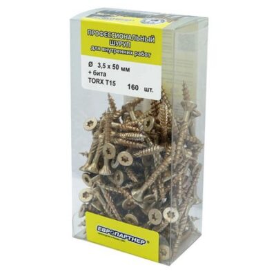 Главная » Строительство и ремонт шуруп конструкционный для дерева 3,5х50мм TORX15 160шт + бита Просмотров 11 Назначение: дерево Размер: 3,5х50 мм Количество в упаковке: 160 шт Дополнительно: шлиц TORX15, в комплекте бита Головка: потайная Материал: сталь закаленная Покрытие: желтопассивированное ЕВРОПАРТНЕР