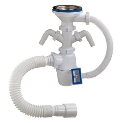 Сифон с большим корпусом и отстойником, выпуском с нержавеющей чашкой D114 мм, двумя отводами под слив от стиральной и посудомоечной машины, с гибкой трубой 40-40/50, для мойки с прямоугольным переливом.