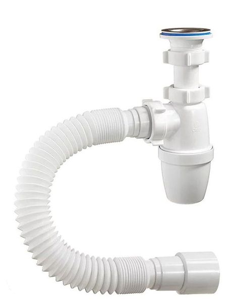 Соединяет мойки и раковины с канализационной трубой, обеспечивает слив стоков, защищает систему канализации от посторонних предметов. Вид сифона: бутылочный;