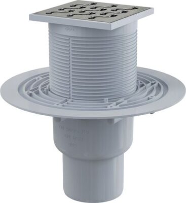 Сливной трап 105×105/50/75 мм прямой сток, решетка из нержавеющей стали, гидрозатвор мокрый AlcaPlast APV202