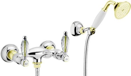 Смеситель для душа Webert Alexandra AL760101017 с душевым гарнитуром, без излива. Цвет: глянцевый хром/золото. Ручки: кристаллы Swarovski. Материал: латунь (содержание свинца: <0.2%). Расстояние между центрами креплений: 134-166 мм. Стандарт подключения: G1/2. ручной душ75 мм. Шланг 1500 мм.