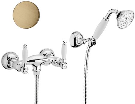 Настенный смеситель для душа Webert Dorian DO760101065 с душевым гарнитуром, без излива. Цвет: бронза. Цвет ручек: белый. Материал: латунь (содержание свинца: <0.2%). Расстояние между центрами креплений: 134-166 мм. Стандарт подключения: G1/2. ручной душ75 мм. Шланг 1500 мм.