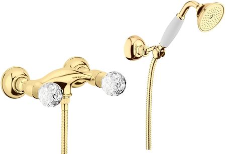 Смеситель для душа Webert Karenina КА760101010 с душевым гарнитуром, без излива. Цвет: золото. Ручки: кристаллы Swarovski. Материал: латунь (содержание свинца: <0.2%). Расстояние между центрами креплений: 134-166 мм. Стандарт подключения: G1/2. ручной душ75 мм. Шланг 1500 мм.