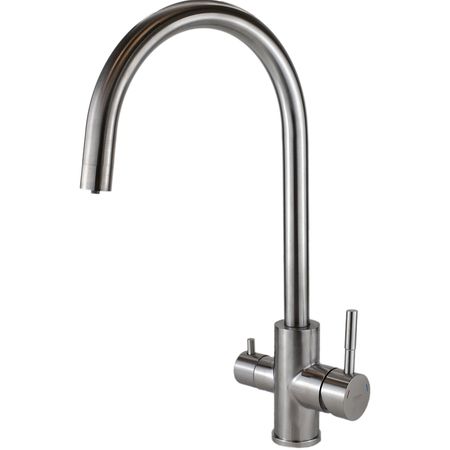 Смеситель Esko K22 имеет современный дизайн и долговечное матовое покрытие, на котором не остается пятен и разводов от известкового налета. Изготовлен из высококачественной и экологически безопасной пищевой нержавеющей стали (0% свинца) и укомплектован европейскими механизмами. Данная модель имеет отдельные водотоки для питьевой и водопроводной воды, а также полный набор для подключения к фильтру.