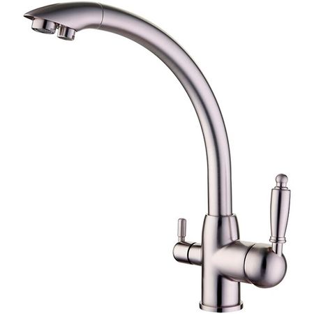 Смеситель для кухни со встроенным фильтром (краном) под питьевую воду Ledeme L4455A-3, у прибора одна рукоять для регулировки воды. Смеситель имеет переключатель для питьевой и обычной воды. При этом, оттоки отделены друг от друга. Обычная водопроводная вода с фильтрованной не будет смешиваться. Аэратор обеспечивает равномерный поток воды, по причине того, что специальная металлическая сеточка будет рассеивать напор, вода становится мягче. Сеточка отфильтрует примеси и сбережет более 5 кубометров воды в год. Данный тип смесителей отличается простым видом установки, когда прибор фиксируется на раковине или столешнице посредством гайки. Она надежно прижимает его к поверхности, закручиваясь с другой стороны отверстия. Современные смесители – это объединение традиционных конструкционных решений и вместе с тем необычного и смелого дизайна. Сантехника отлично подходит тем, кто стремится идти в ногу со временем. Материал корпуса — латунь, надежный красивый материал высокого качества, который обеспечивает отличное напыление хромированного покрытия. Прибор обычной округлой формы. Известная модель, которая имеет поворотный излив. Его можно вращать в различные стороны, что существенно повышает эффективность использования такого сантехнического прибора. При установке будет достаточно, если в умывальнике или раковине находится всего одно отверстие под прибор. Основным образом, подобный подход гарантирует быстрый монтаж. В комплекте идет, инструкция по установке, гарантийный талон.