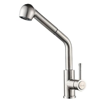 Смеситель для кухни с выдвижной лейкой Ledeme L76014, имеет одну рукоять с целью контроля напора. Прибор выделяется практичным управлением и стабильностью во время работы, по этой причине пользуется в наше время очень большой востребовательностью у клиентов. Качественный аэратор в смесителе обеспечит равномерный поток, с помощью того, что специальная металлическая сеточка будет рассеивать напор, вода становится мягче. Также сеточка отфильтрует примеси и сэкономит около 5 кубометров воды в течение года. Прибор устанавливается с помощью гайки, нижняя часть корпуса вставляется в специальное отверстие для установки и с обратной стороны затягивается гайкой. Прибор выполнен в новом современном стиле, необычная модель в явно выраженном дизайнерском исполнении. Нержавеющая сталь – это еще один общераспространенный материал, используемый в процессе изготовления смесителей. Модели отличаются долгим сроком использования и почти не имеют необходимости в уходе. Модель обычной округлой формы. Смеситель с выдвижным изливом. При помощи выдвижного гибкого шланга, излив вытягивается из держателя. Имеется 2 режима работы, аэрированная струя и душ. С целью переключения режимов в сопле распылителя установлена силиконовая вставка. Аэрированной струей Прибор со стационарным изливом. Внутри данного смесителя присутствует керамический картридж 35 миллиметров, который смешивает воду для получения необходимого показателя температуры. Особенностью модели такого типа считаются долговечность и надежность. Это смеситель с традиционным изливом и функцией душа. Можно переключать смеситель между обычным и душевым режимом посредством нажатия на кнопку на корпусе. При монтаже модели достаточно, если в умывальнике или раковине имеется одно отверстие под прибор. В основном, такой подход гарантирует быстрый и легкий монтаж. В комплекте идет, инструкция по установке, гарантийный талон.