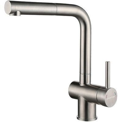 Смеситель для кухни Paulmark Dosse Do214418-SS. Изготовлен из нержавеющей стали AISI 304. Нержавеющая сталь AISI 304 легирована никелем, марганцем, медью и хромом, что обеспечивает ей повышенную прочность и устойчивость в коррозионных средах, такая сталь подвержена деформациям.