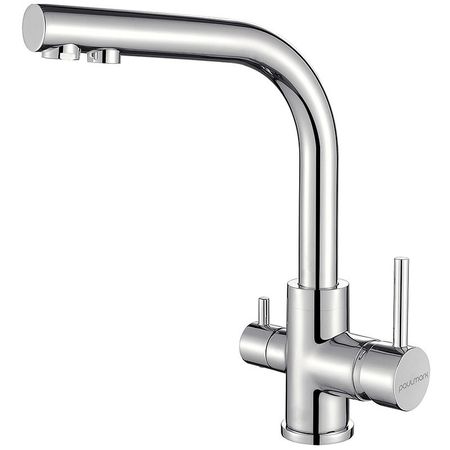 Однорычажный смеситель для кухонной мойки Paulmark Essen Es213011-CR. Цвет: хром. Универсальный дизайн изделия дополнит большинство кухонь в современном стиле. Оснащен дополнительным краном с подключением фильтра питьевой воды. Изготовлен из высококачественной латуни с многослойным и стойким к истиранию покрытием. Керамический картридж Paulmark 40 мм с ресурсом открываний/закрываний в 500 000 раз обеспечивает точную настройку температуры и напора воды. Излив с поворотом на 360 градусов и отдельным каналом для потока фильтрованной воды. Съемный пластиковый аэратор Caskad с защитой от известковых отложений делает струю мягкой, ровной и экономичной. Гибкая подводка в оплетке из нержавеющей стали длиной 40 см, G 1/2. Простой и быстрый монтаж. В комплекте поставки: смеситель для кухни, гибкая подводка, усиленное крепление, переходник для подключения фильтра.