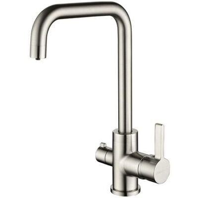 Высокий смеситель для кухни Paulmark Logas Lo213021-NI однорычажный, с поворотным изливом, с возможностью подключения фильтра питьевой воды. Фильтрованная вода подается через отдельные трубку и аэратор. Латунь высокого качества. Многослойное, стойкое к истиранию матовое покрытие. Долговечный керамический картридж. Съемный пластиковый аэратор. Простой монтаж.