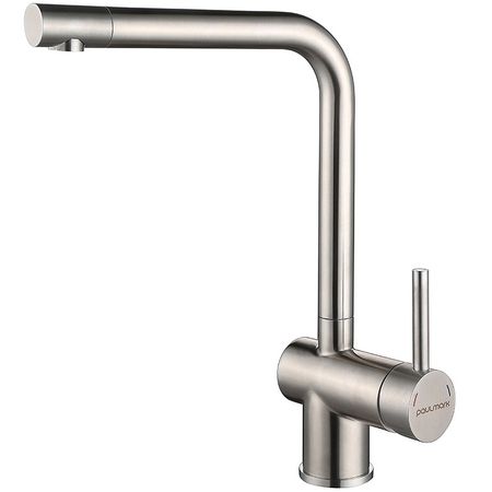 Смеситель для кухни Paulmark Spring Sp212067-SS. Изготовлен из нержавеющей стали AISI 304. Нержавеющая сталь AISI 304 легирована никелем, марганцем, медью и хромом, что обеспечивает ей повышенную прочность и устойчивость в коррозионных средах, такая сталь подвержена деформациям.