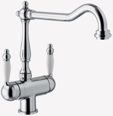 Однорычажный смеситель для кухни, с переключателем (с девиатором) для питьевой воды, с ручками, стилизованными под керамику, с поворотным изливом: 360°, устанавливаемый на одно отверстие.