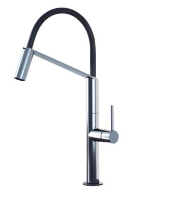 Смеситель Webert Kitchen Oblique Pro OB920602015 с гибким, съемным изливом. Цвет: глянцевый хром/черный. Материал корпуса: латунь. излив: 360°. Длина излива: 220 мм. Один режим струи. Высота смесителя: 475 мм. Керамический картридж 25 мм. Гибкая подводка G1/2 из нержавеющей стали длиной 370 мм.