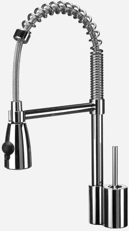 Описание: высокий, однорычажный, профессиональный смеситель для кухни устанавливаемый в одно отверстие, с поворотным, съемным, гибким, пружинистым изливом.