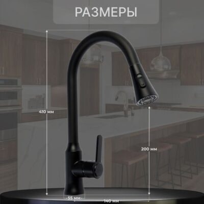 Смеситель для кухни ZEIN Z3708, вытяжной излив, аэратор 2 режима, черный. <b> Характеристики:</b> <ul> <li> Высота смесителя: 41 см.</li> <li> Высота излива: 20 см.</li> <li> Длина смесителя: 30 см.</li> <li> Длина излива: 14 см.</li> <li> Диаметр основания: 5,5 см.</li> </ul>