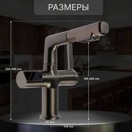 Смеситель для кухни zein z3782, экран температуры, вытяжной излив, высота 18-25 см, 2 режима