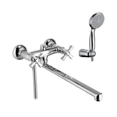 Смеситель универсальный с плоским изливом 350 мм Аэратор Кран-буксы с керамическими пластинами (угол поворота – 180 градусов) Переключатель с керамическими пластинами Поворотный уголок Аксессуары в комплекте (шланг 1,5 м. повышенной прочности с двухзагибной латунной оплеткой, настенное поворотное крепление, лейка ЛЮКС) Металлические рукоятки