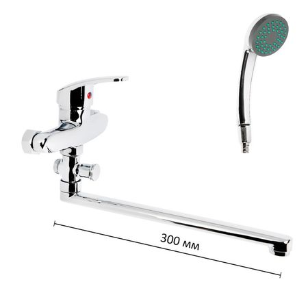 Однорычажный пристенный смеситель для ванны с ручкой Типа С из прочного пластика с устойчивым хромоникелевым покрытием имеет плоский поворотный излив из нержавеющей стали. Изделие оснащено качественным аэратором с пластиковым сердечником типа «Бенц». Картридж металлокерамический.Комплект пристенного крепления включает в себя уплотнительные прокладки, эксцентрики и глубокие хромированные чашки отражателей. Дивертор (переключатель) с излива на душ — наружный, штокового типа.В комплект входит двухпозиционный пристенный держатель лейки, лейка и шланг для душа.