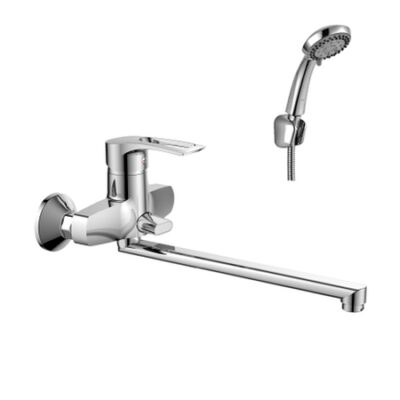 Смеситель универсальный с плоским поворотным изливом 350 мм В комплекте: Пластиковый аэратор с функцией легкой очистки Керамический картридж 40 мм Переключатель с керамическими пластинами Аксессуары в комплекте (шланг 1,5 м, настенное крепление, 5-функциональная лейка с функцией легкой очистки) Присоединительная группа (эксцентрики с отражателями) для вертикального крепления Металлическая рукоятка