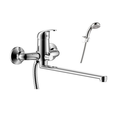 Смеситель универсальный с плоским поворотным изливом 350 мм В комплекте: Пластиковый аэратор с функцией легкой очистки Керамический картридж 35 мм Переключатель с керамическими пластинами Аксессуары в комплекте (шланг 1,5 м, настенное крепление, 1-функциональная лейка с функцией легкой очистки) Присоединительная группа (эксцентрики с отражателями) для вертикального крепления Металлическая рукоятка