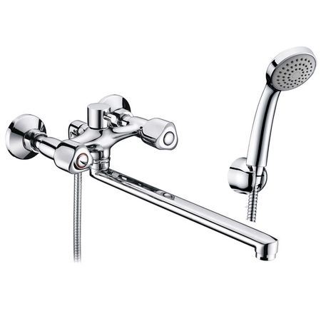 Amper Тип: двухвентильный Длина излива: 322 мм Материал: латунь Цвет: хром Комплектация: насадка душевая, шланг 1,5 м, подключение к лейке, крепление для душа