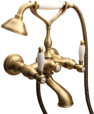 Описание:Настенный смеситель для ванны двухвентильный, устанавливаемый в два отверстия, в комплекте с душевым гарнитуром, с ручками стилизованными под керамику.