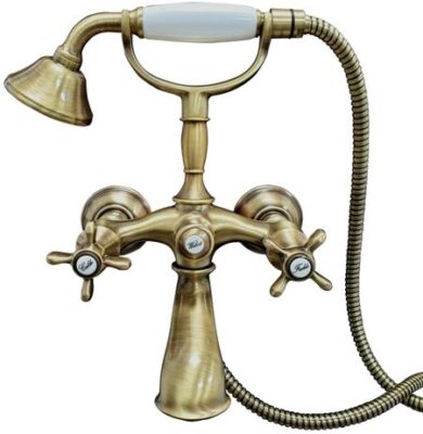 Описание:двухвентильный cмеситель для ванны, в комплекте с душевым гарнитуром, с ручками из термопластичной резины, стилизованными под керамику, устанавливаемый в два отверстия.