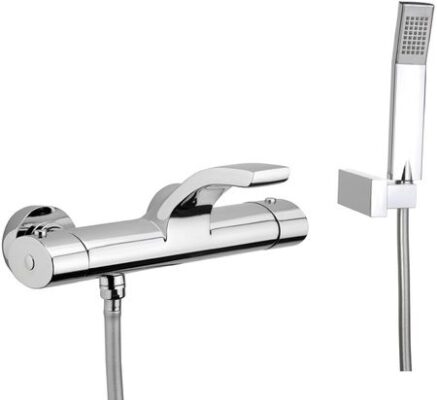 Описание:однорычажный термостатический смеситель для ванны, настенный, устанавливаемый в два отверстия, в комплекте с душевым гарнитуром.