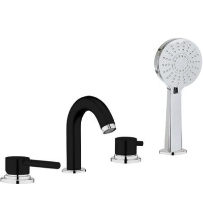Смеситель на борт ванны Webert Elio EL850701564 в комплекте с душевым гарнитуром. Керамический картридж 35 мм. Контроль потока воды и температуры. Настройка эксплуатационных параметров. Излив 11,8 см Стандарт подключения G1/2. Шланг 150 см. Ручная лейка из PVC, с антиизвестковым покрытием и переключателем режимов.