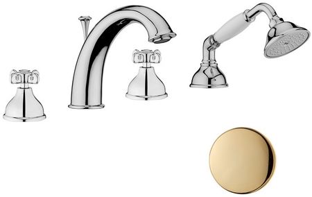 Описание:смеситель на борт ванны, двухвентильный, устанавливаемый на четыре отверстия, в комплекте с душевым гарнитуром.