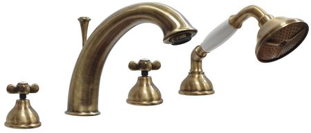 Описание:смеситель на борт ванны, двухвентильный, устанавливаемый на четыре отверстия, в комплекте с душевым гарнитуром.