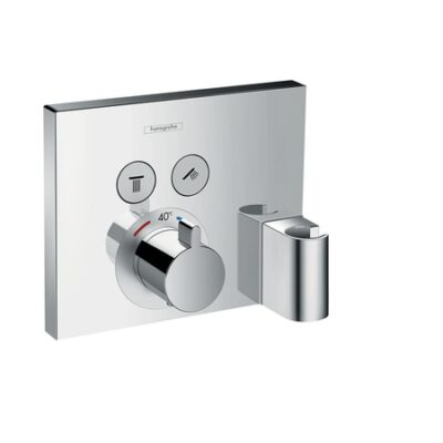 15765000 HG ShowerSelect термостатический смеситель (внешняя часть) Характеристики продукта — 2 потребителя — возможно одновременное включение нескольких потребителей (душей) — предохранительный ограничитель при 40°C — расход воды – верхний сток: 29 л/мин — встроенный держатель душа — Скрытая часть в комплект не входит Необходимые принадлежности iBox universal скрытая часть, ½’ / ¾’