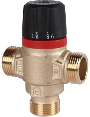 Термостатический смесительный клапан Rommer (Роммер) 3/4″ НР 20-43 С KV 1,6 (RVM-0121-164320) боковое смешивание используется для создания необходимого температурного режима в системе отопления или ГВС. Конструкция представлена в латунном корпусе и оснащена термочувствительным элементом французского производства.