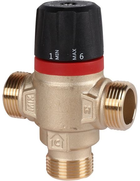 Термостатический смесительный клапан Rommer (Роммер) 3/4″ НР 35-60 С KV 1,6 (RVM-0122-166020) боковое смешивание выполнен из прочным, устойчивых к коррозии материалов — латуни и нержавеющей стали. Устройство оснащено удобным регулятором для настраивания температурного уровня в отопительной системе или ГВС.