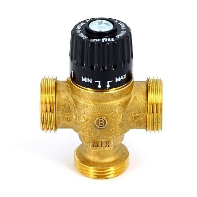 Клапан Uni-Fitt (Уни-Фит) Н 1 термосмесительный 30-65С, смешение в центр, латунный — необходимый элемент для распределения потока теплоносителя, контроля и поддержания заданной температуры в системах отопления путем смешивания горячей и холодной воды. Корпус и шток выполнены из коррозионностойкой латуни, а уплотнитель из высокопрочной резины обеспечивает отсутствие протечек. Клапан может быть установлен в любом положении: горизонтальном или вертикальном.