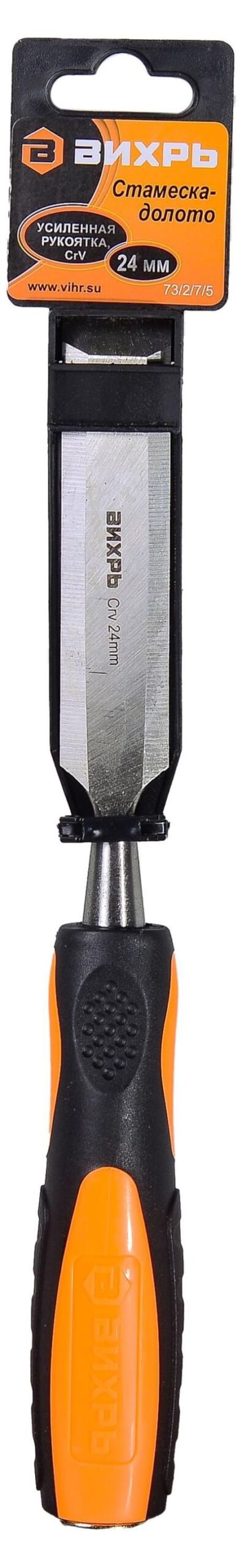 Стамеска-долото 24 мм 2 компонентная усиленная рукоятка CrV Вихрь 73/2/7/5 — удобный инструмент, при помощи которого можно работать с различными сортами древесины. Изделие обеспечивает высокую производительность за счет эргономичной рукоятки с рельефной поверхностью.