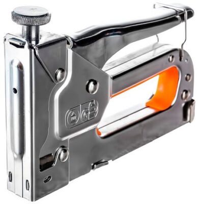 Строительный степлер представляет собой ручной инструмент для крепления различных элементов. Строительный степлер можно использовать при проведении таких работ: обивка мебели — любые виды ткани, кожа, замша, микрофайбер и т.д.; фиксация утеплителя, паро- и гидроизоляции при монтаже полов, стен, потолка; крепление плакатов и фотообоев к стене и щитам; фиксация в шкафах задних стенок из ДВП, оргалита, фанеры и других литовых материалов; сборка упаковочных конструкций, сшивание гофрокартона; установка штапиков на оконных рамах; монтаж шпунтованной доски на полу и крепление напольного покрытия; монтаж теплиц и парников; крепление кабелей и проводов; облицовка полимерными плитами и драпировка тканью; другие монтажные и отделочные работы. Особенности: Усиленный механизм отбойника позволяет забивать скобы в материал высокой жёсткости. Регулировка силы удара позволяет снизить отдачу и уровень шума. Усиленная конструкция продлевает срок использования инструмента. Характеристики:Прочный металлический корпусРазмеры скоб: 4-14 ммРегулировка силы удара