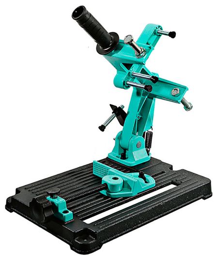 Стойка для крепления УШМ 150/180/230 мм, чугун. Основание, быстрозаж. Тиски SturmПреимущества:Чугунное основаниеНадежная конструкция без люфтовТиски для защиты детали под угломБыстрозажимные тискиТехнические характеристики:Max размер зажимаемой детали под 45 (мм): 70x70Max размер зажимаемой детали под 0 (мм): 100×100Максимальная ширина заготовки (мм): 100Материал основания: чугунРазмер основания (мм): 275*290Угол поворота тисков относительно стола (): 0-45Размер присоединяемой УШМ: 150/180/230