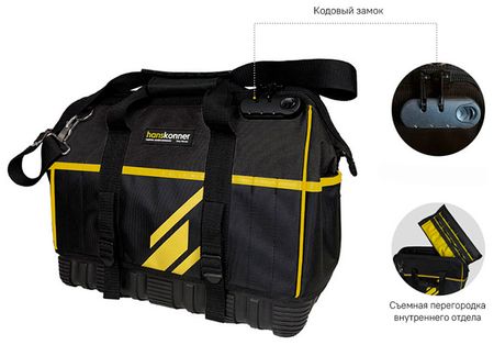 Сумка для инструментов предназначена для сегментированного комфортного хранения и переноски инструмента. ОсобенностиОснащена кодовым замком для безопасного хранения инструмента внутри. 100 полиэстер выдерживает нагрузку в 30 кг, устойчив к растяжению и стиранию. Быстрая широкая молния позволяет мгновенно открыть сумку и получить доступ к инструменту. Съёмная перегородка во внутреннем отделе сумки помогает зонировать пространство для инструмента, а так же сама снабжена карманами. Дно выполнено из пластика для защиты инструмента как от ударного внешнего воздействия, так и от возможного контакта с водой. Характеристики:Размер (ДхШхВ):410x320x200 ммКол-во карманов (шт): 38Фиксатор раскрытого состояния сумкиЦентральная перегородка с карманамиПластиковое дноМатериал: 100 полиэстер