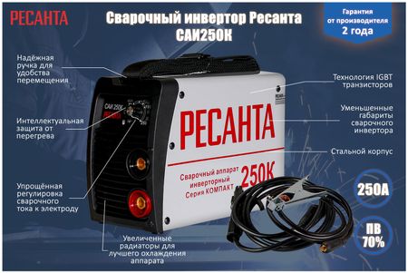Сварочный аппарат РЕСАНТА САИ-250К применяется в работе с ручной дуговой сваркой штучным электродом до 6 мм. Данная модель считается профессиональной и применяется в основном на производстве.Регулировка тока плавная и удобная, можно проконтролировать ход работы и сварить качественный шов. Система защиты от перегрева обеспечивает безопасность и продлевает срок службы аппарата.Особенности:Максимальный сварочный ток 220А позволяет использовать электроды диаметром до 6 мм и сварить стальные конструкции толщиной от 15 мм.Небольшой вес и габариты.В серии Компакт это самая мощная модель, применяется на производстве.Функция форсажа дуги (ARC FORCE) повышает устойчивость дуги и улучшает текучесть металла для повышения качества шва.Преимущества:- Аппарат защищен от перегрева при работе на максимальной мощности и в условиях с повышенной температурой.- Плавная регулировка сварочного тока дает ровный и качественный шов.- Малое энергопотребление экономит электричество и позволяет работать от обычной розетки 220 В.- Функция анти залипания (ANTI STICK) позволяет обезопасить работу и продлить срок службы аппарата.- Начать работу со сваркой теперь легче с удобной функцией горячего старта (HOT START).- Система принудительного туннельного охлаждения дает возможность дольше сохранять аппарат в рабочем состоянии.- Металлический корпус защищает аппарат от внешних воздействий и попадания вертикально падающих капель.Характеристики:Диапазон рабочего напряжения: 220/-10Максимальный потребляемый ток: 42.5 АНапряжение холостого хода: 80 ВДиапазон регулирования сварочного тока: 10-250 АПродолжительность нагружения: 70 220AМаксимальный диаметр электрода: 6 ммКласс защиты: IP21Вес: 4.6 кгКомплектация:Сварочный инверторКабель с электрододержателемКабель с клеммой заземленияПаспорт изделия