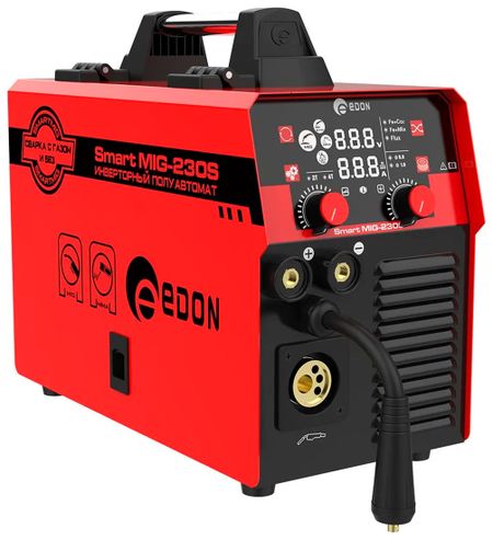 Инверторный сварочный аппарат Edon Smart MIG-230S — это современный и надежный цифровой аппарат, обеспечивающий высокое качество сварных швов и используемый для сварки различных типов металлов. Предназначен для полуавтоматической сварки в среде защитных газов (MIG/MAG), безгазовой сварки самозащитной (порошковой) проволокой (FCAW), дуговой сварки штучным электродом (MMA) и LIFT-TIG сварки, то есть сварочный аппарат является универсальным. Сварочный аппарат обладает компактным дизайном, что делает его удобным для использования в любых условиях. Напряжение и сварочный ток контролируются различными регуляторами с помощью нажатия.В целом, Edon Smart MIG-230S отличается надежностью и простотой в использовании, что делает его отличным выбором как для профессиональных сварщиков, так и для начинающих.Особенности:- инверторная технология;- евро разъем;- высокое значение максимального тока;- технологии ANTISTICK, HOT START и ARC FORCE;- универсальный;- есть функция LIFT-TIG;- режим 2T/4T- режим SYN, настраивающий сварочный аппарат под заданные параметры;- умный контроллер режимов сварки;- сварка тонких металлов и нержавеющей стали;- информативный дисплей;- удобная ручка для переноски;- высокое качество, портативный, многофункциональный.Технические характеристики:Тип аппарата: инверторКласс аппарата: полупрофессиональныйВходное напряжение (В): 220 ВТип тока: постоянныйПолуавтоматическая сварка (MIG/MAG): ДаРучная дуговая сварка (MMA): ДаFCAW — сварка самозащитной проволокой: ДаLIFT-TIG — упрощенная функция TIG сварки: ДаКоличество фаз питания на входе: 1Мощность, кВт.: 10,8Сварочный ток (MIG/MAG), min, (А): 50Сварочный ток (MIG/MAG), max, (А): 230Сварочный ток (MMA), min, (А): 20Сварочный ток (MMA), max, (А): 230Напряжение холостого хода (В): 57КПД (): 85Степень защиты: IP21SКласс изоляции: FAntistick (Антизалипание): ДаArc Forse (Форсаж дуги): ДаHot Start (Горячий старт): ДаТип поджига дуги: Высокая частотаДлина сетевого кабеля, м: 1,7Вес, кг: 11.5Комплектация:- сварочный аппарат — 1 шт.;- сварочная горелка, длина 3 м. — 1 шт.;- комплект ЗИП для полуавтоматической горелки — 1 комплект;- кабель-масса с зажимом, сечение 14 мм2, длина 1,85 м., типоразмер силового штекера 10-25 — 1 шт.;- электрододержатель с силовым кабелем, сечение 14 мм2, длина 2,9 м., типоразмер силового штекера 10-25 — 1 шт.;- проволока порошковая 1,0 мм., 0,25 кг. — 1 шт.;- проволока стальная омедненная 0,8 мм., 1 кг. — 1 шт.;- щетка по металлу — 1 шт.;- газовый шланг — 1 шт.;- перчатки для сварки — 1 комплект;- руководство по эксплуатации — 1 шт.;- упаковка — 1 шт.