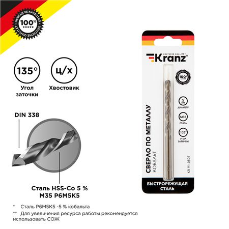 Главная » Строительство и ремонт Сверла Kranz Сверло по металлу 5х86х52мм «Кобальт» (сталь HSS-Co 5% M35 P6M5K5) DIN 338, 1 шт. в блистере KRANZ Просмотров 16 Широкий ассортимент по выгодным ценам. Регулярные акции. Программа лояльности Kranz