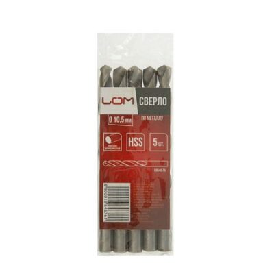 Сверло по металлу ЛОМ, HSS, цилиндрический хвостовик, 10.5×135 мм, 5 шт.. Сверло с цилиндрическим хвостовиком предназначено для использования с дрелью. Изделие применяется для создания сквозных отверстий в металле.