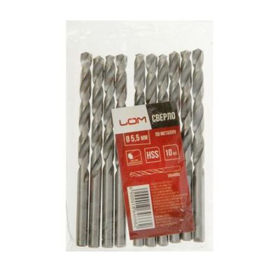 Сверло по металлу ЛОМ, HSS, цилиндрический хвостовик, 5.5×95 мм, 10 шт.. Сверло с цилиндрическим хвостовиком предназначено для использования с дрелью. Изделие применяется для создания сквозных отверстий в металле.